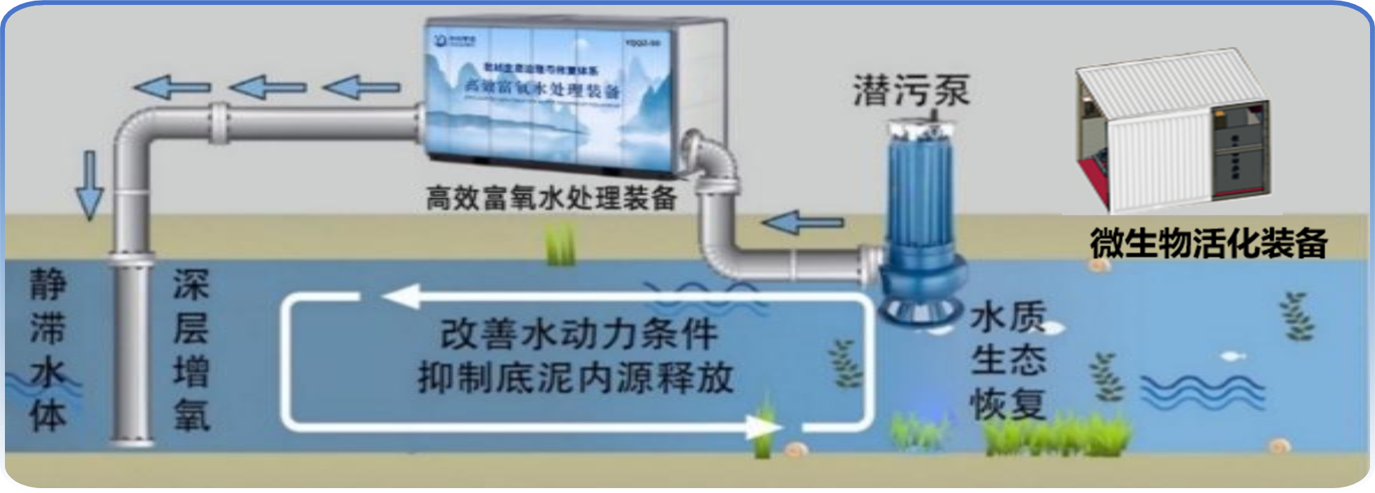 1、物理-生物耦合:高效富氧装备给予高溶氧环境,加速水体中微生物代谢速率,缩短净化周期。